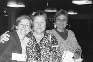 L-R Joy Carlin, Linda Hoy and Irene Oppenheim, between scenes on location in the former San Francisco trans-bay terminal